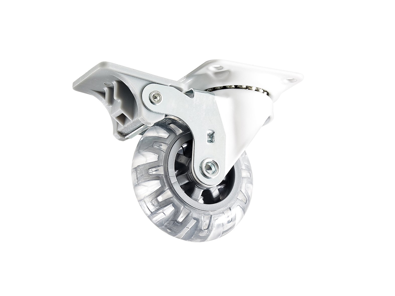 Kääntyvä kalustepyörä ø 50 mm läpinäkyvää polyuretaania, jarrulla ja levyllä 42x42 mm, valkoinen. Maksimipainoraja/pyörä 40 kg on laskennallinen. Vaunupyörä