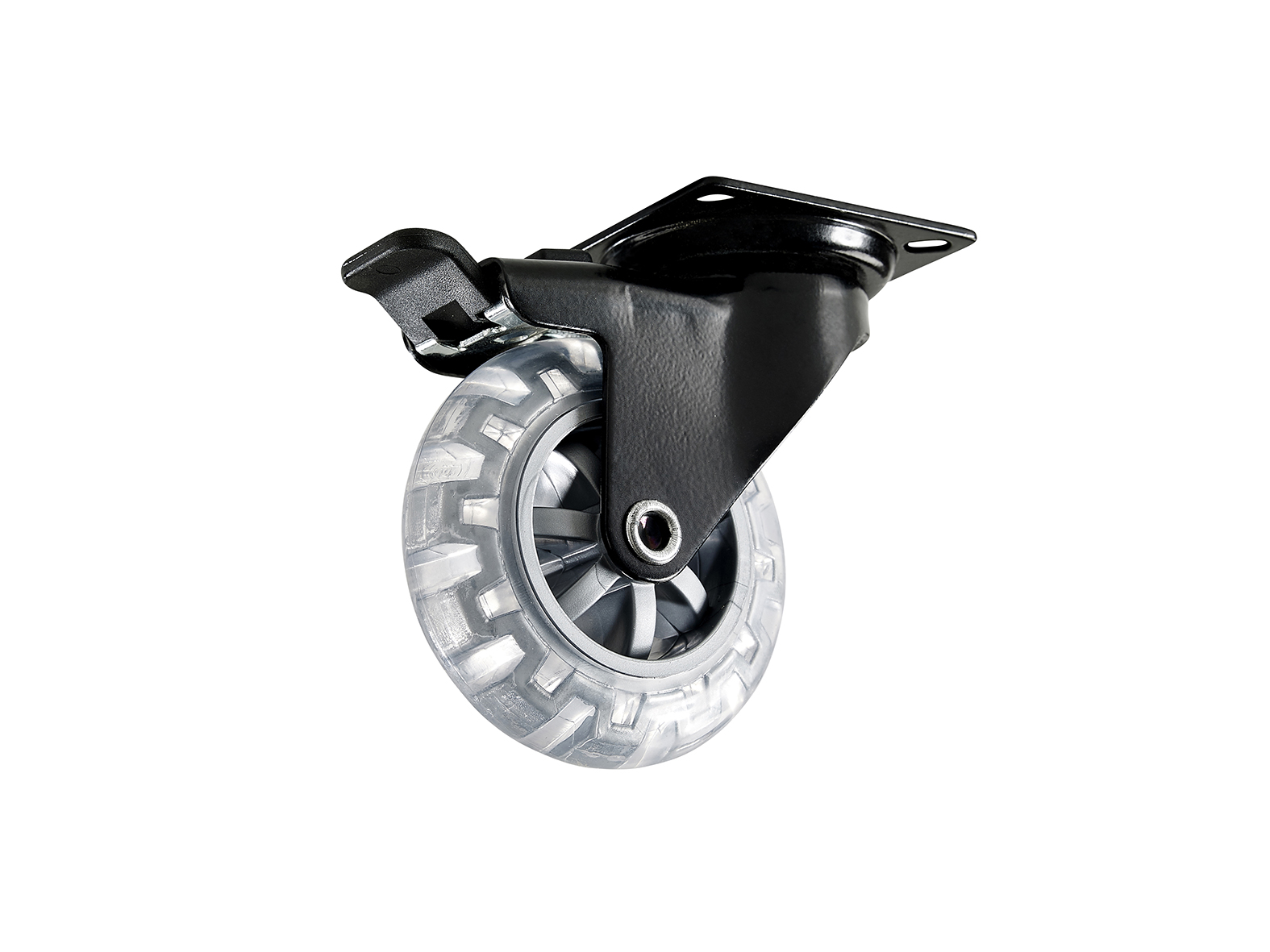 Kääntyvä kalustepyörä ø 75 mm läpinäkyvää polyuretaania, jarrulla ja levyllä 60x60 mm, musta. Maksimipainoraja/pyörä 55 kg on laskennallinen. Vaunupyörä