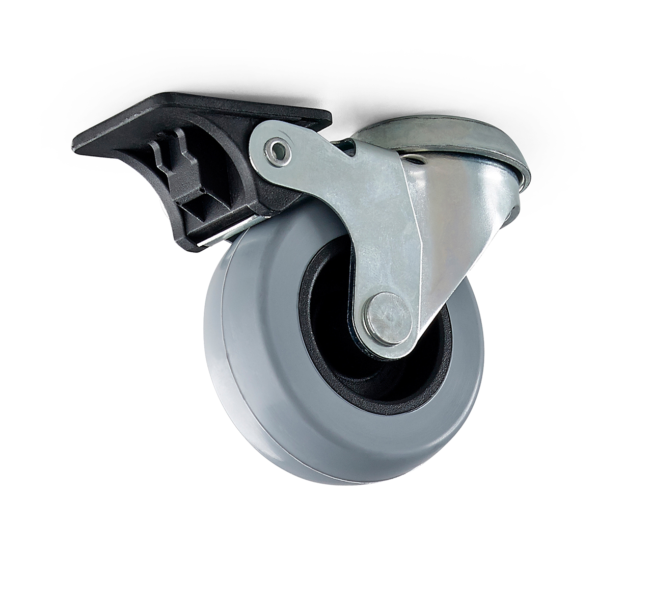 Kääntyvä kalustepyörä ø 75 mm jarrulla ja M10-ruuvikierteellä harmaasta polyuretaanista. Maksimipainoraja/pyörä 55 kg on laskennallinen. Vaunupyörä