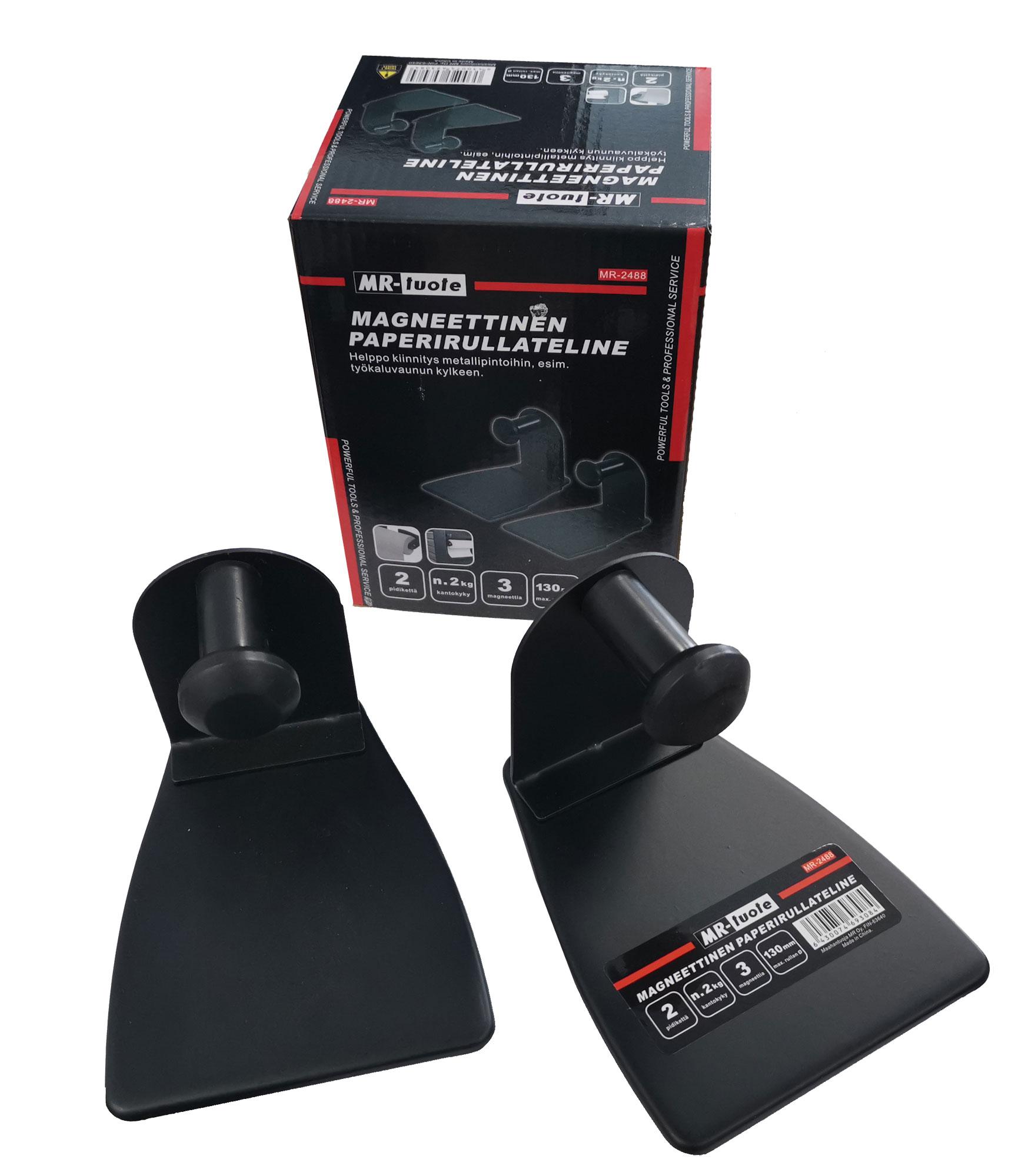 Helppo kiinnitys metallipintoihin esim. työkaluvaunun kylkeen, pakettiautoon, peltiseinään yms. - 2 pidikettä - n. 2 kg kantokyky - 3 magneettia - max rullan Ø 130 mm