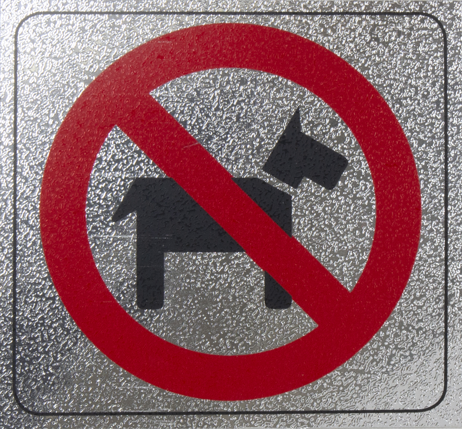 Kuvatarra, jossa koirasymboli, Tarra sopii hyvin esimerkiksi julkisten tilojen, kuten kauppojen, kirjastoiden, teattereiden, terveyskeskusten yms, merkitsemiseen, mihin ei saa tuoda eläimiä, Selkeä... Lue lisää