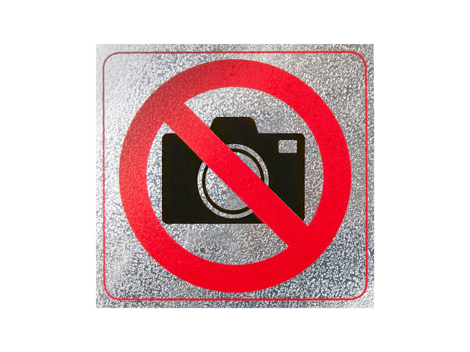 Kuvatarra, jossa kamerasymboli, Tarra sopii hyvin esimerkiksi julkisten tilojen, kuten kauppojen, kirjastoiden, teattereiden, terveyskeskusten yms, merkitsemiseen, Selkeä kuva kertoo viestin myös luku- ja kielitaidottomille, Pitävä tarra on veden- ja säänkestävä ja sen hopeinen pinta muistuttaa metallia, Painatus mustalla,