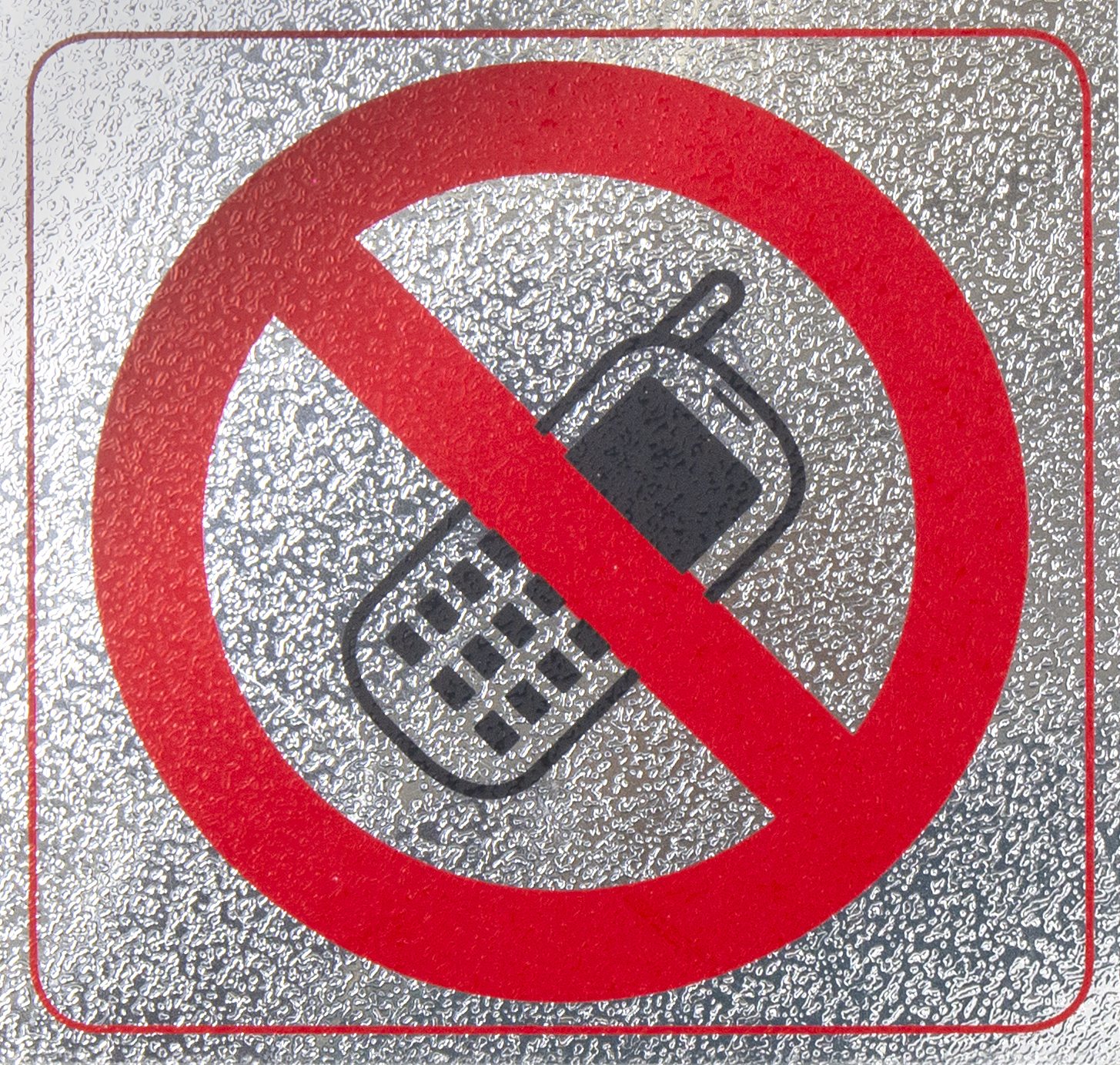 Kuvatarra, jossa puhelimen kuva ja käyttö kielletty -symboli, Selkeä kuva kertoo viestin myös luku- ja kielitaidottomille, Pitävä tarra on veden- ja säänkestävä ja sen hopeinen pinta muistuttaa metallia, Painatus mustalla,