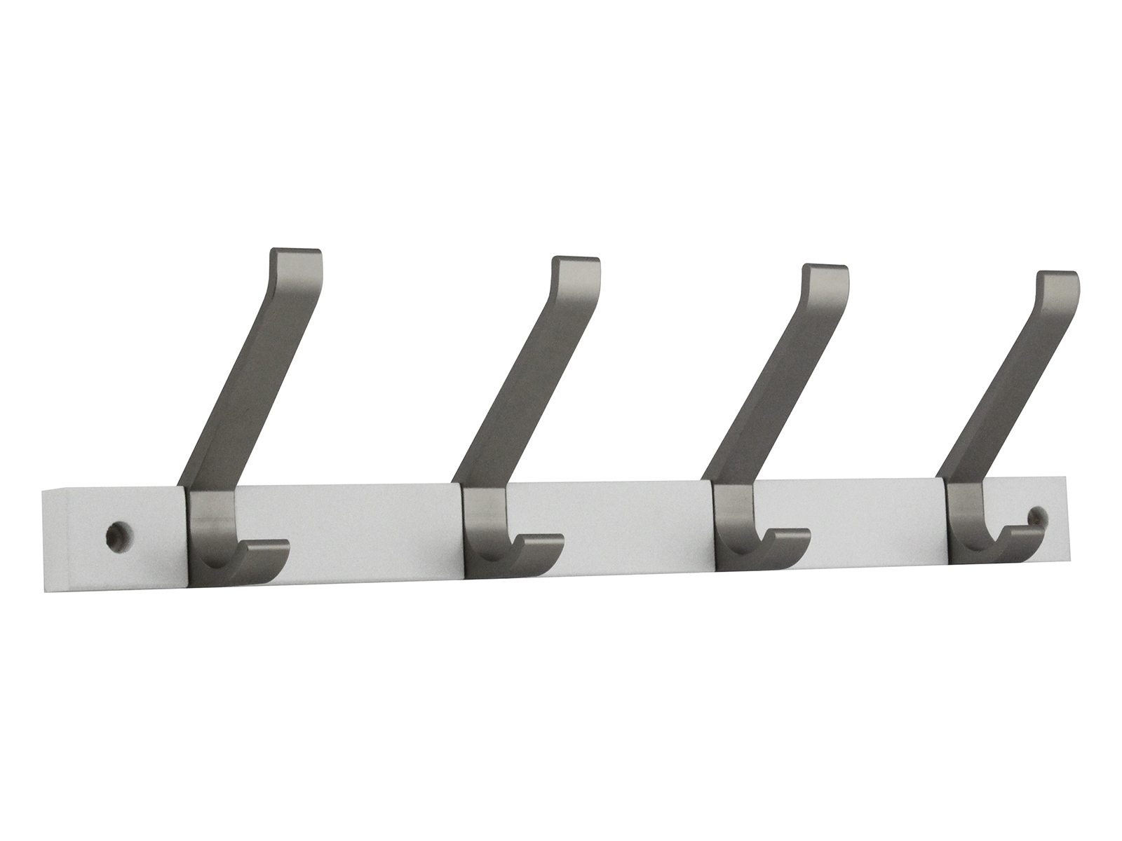 Tyylikäs 4- koukkuinen naulakko, Taustaosa maalattua puuta ja upotetut koukut niklattua alumiinia
