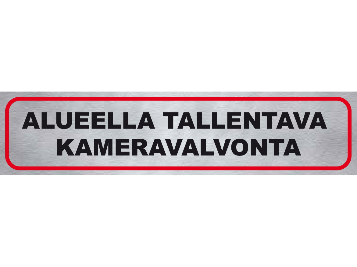 Veden- ja säänkestävä itseliimautuva infotekstitarra, Ulkonäkö metallia muistuttava, hopeanvärisellä taustalla mustat kirjaimet punaisessa kehyksessä, heijastava,