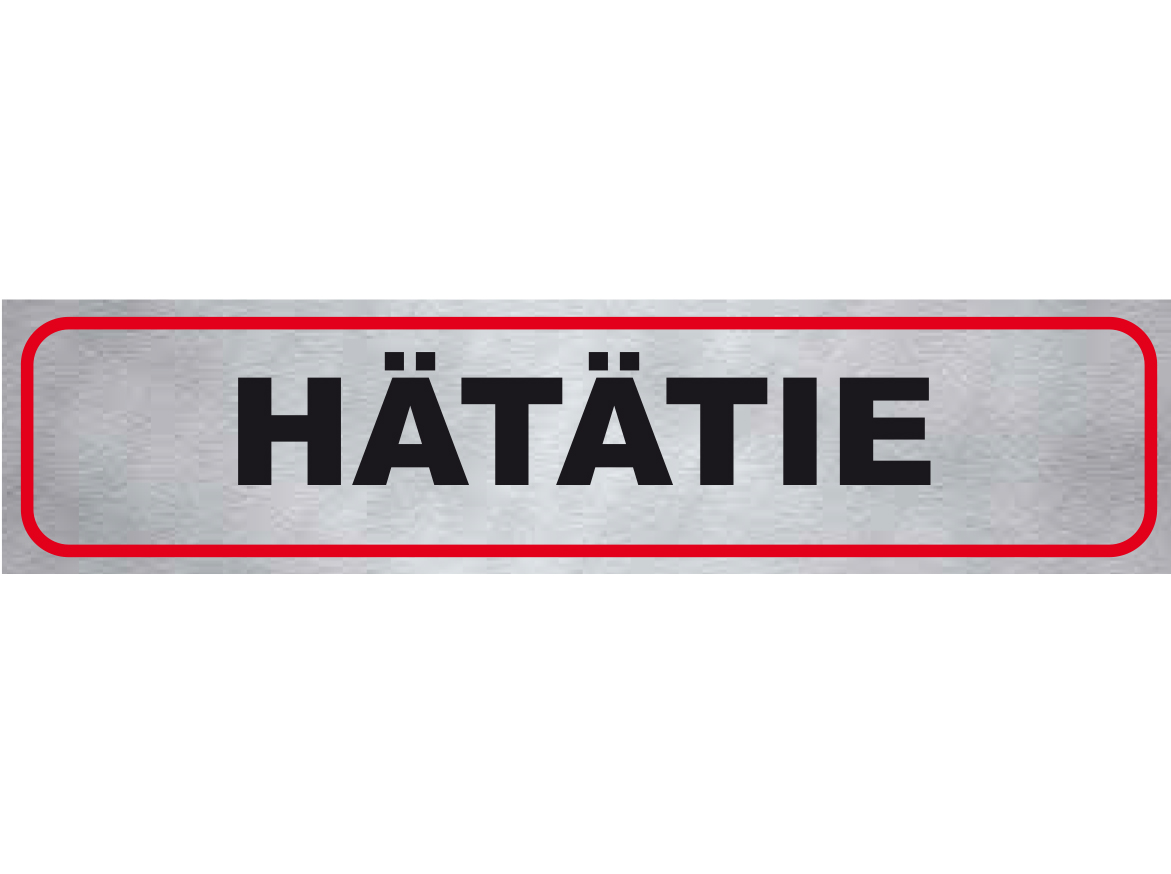 Veden- ja säänkestävä itseliimautuva infotekstitarra, Ulkonäkö metallia muistuttava, hopeanvärisellä taustalla mustat kirjaimet punaisessa kehyksessä, heijastava