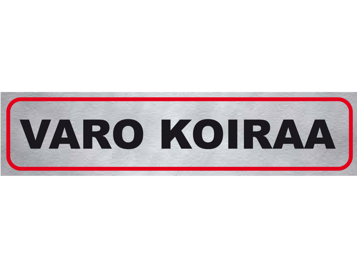 Veden- ja säänkestävä itseliimautuva infotekstitarra, Ulkonäkö metallia muistuttava, hopeanvärisellä taustalla mustat kirjaimet punaisessa kehyksessä, heijastava,