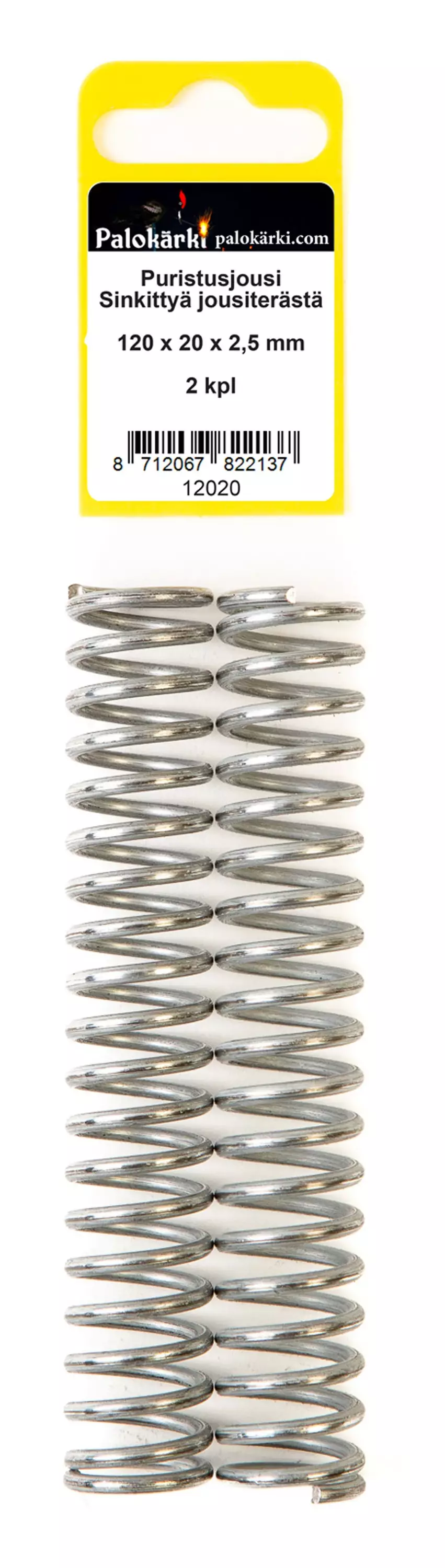 Jousiteräksestä valmistettu puristusjousi on erinomainen valinta ammatti- ja harrastekohteisiin. Jousiteräksestä valmistettulla jousella on erinomainen jousivoima, tarkkuus ja palautuksen kesto. Kuormitettavuus on huippuluokkaa. Jousiteräksestä valmistettu jousi on vahva ja jämäkkä. Pituus 120 mm. Ulkohalkaisija 20 mm. Langan paksuus 2,5 mm. Materiaali sinkittyä jousiterästä. Kierrosmäärä 20. Voima 4,13 Kg/cm.