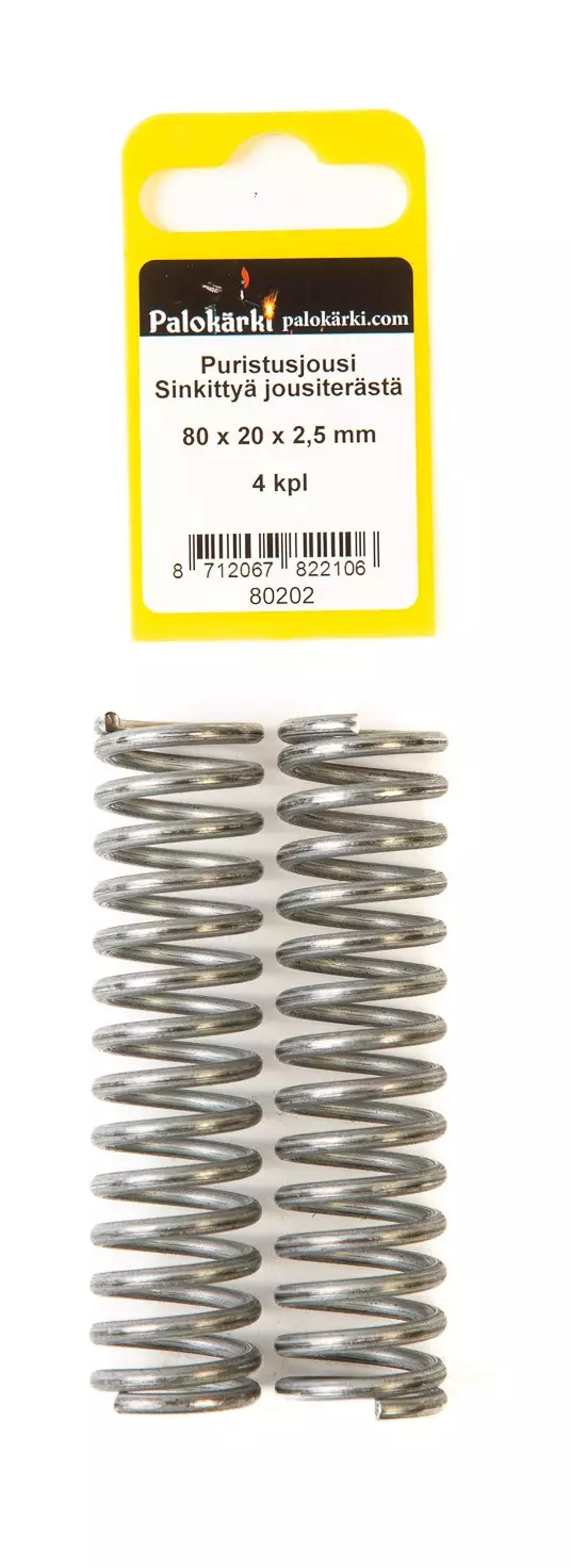 Jousiteräksestä valmistettu puristusjousi on erinomainen valinta ammatti- ja harrastekohteisiin. Jousiteräksestä valmistettulla jousella on erinomainen jousivoima, tarkkuus ja palautuksen kesto. Kuormitettavuus on huippuluokkaa. Jousiteräksestä valmistettu jousi on vahva ja jämäkkä. Pituus 80 mm. Ulkohalkaisija 20 mm. Langan paksuus 2,5 mm. Materiaali sinkittyä jousiterästä. Kierrosmäärä 15. Voima 5,71 Kg/cm.
