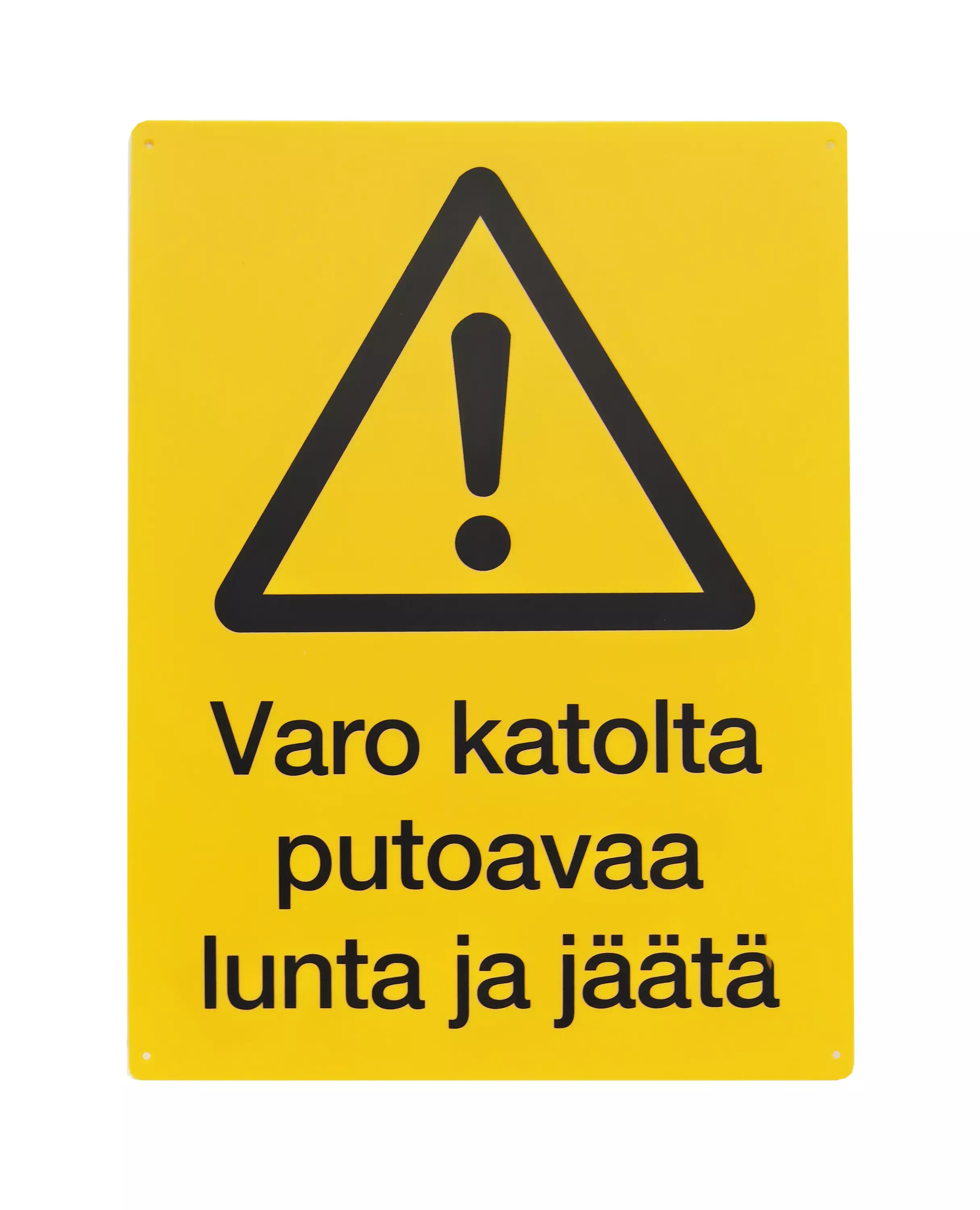 Varoitusmerkki: "Varo katolta putoavaa lunta ja jäätä". Koko: 30 x 40cm. varoituskyltti, varoitus, huomio, huomiokyltti, huomiomerkki, merkki, kieltomerkki, kielto
