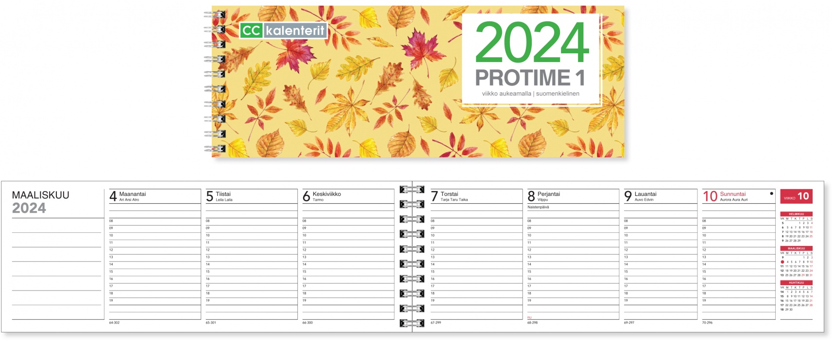 Kierrätyspaperi ja -kierrätyskartonkikannet. Koko 255 x 95 mm. Viikko aukeamalla, tunnit 8-19 (myös viikonloppuna), liputuspäivät, kansalliset pyhät aukeamilla ja luettelona, nimipäivät, muistiinpanosivuja. Wiresidottu. Suomenkielinen.