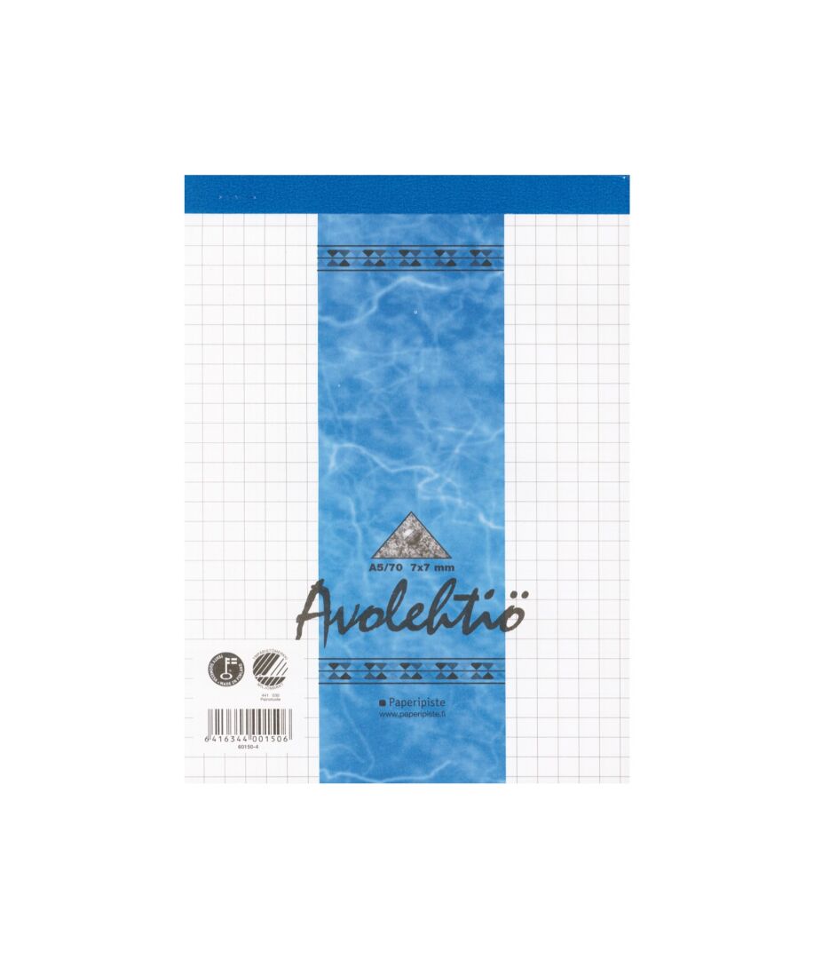 Laadukas kotimainen avolehtiö. 7×7 mm ruudutus, 70 lehteä, valkoinen 60g paperi. Puuvapaa valkoinen paperi. Yläreunassa perforointi helpottamassa lehden irtirepäisyä. Tuotteella Joutsenmerkki ja Avainlippu.