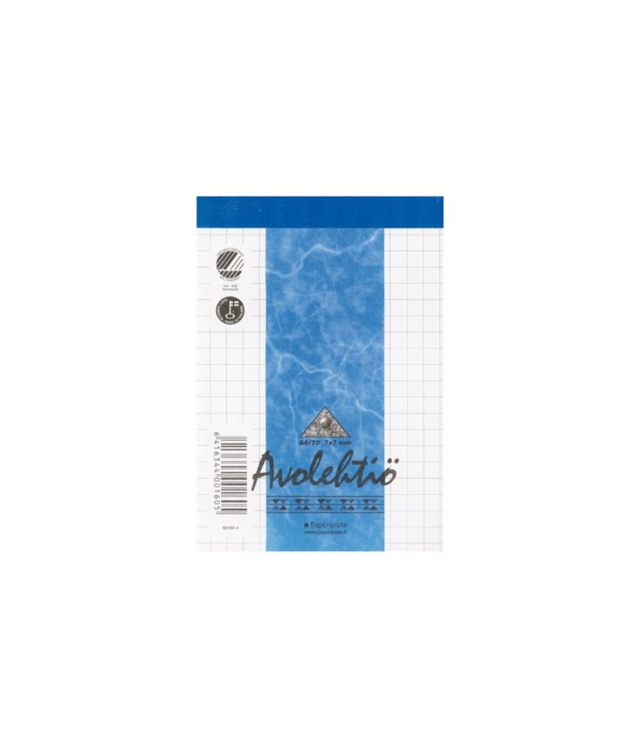 Laadukas kotimainen avolehtiö. 7×7 mm ruudutus, 70 lehteä, valkoinen 60g paperi. Puuvapaa valkoinen paperi. Yläreunassa perforointi helpottamassa lehden irtirepäisyä. Tuotteella Joutsenmerkki ja Avainlippu.