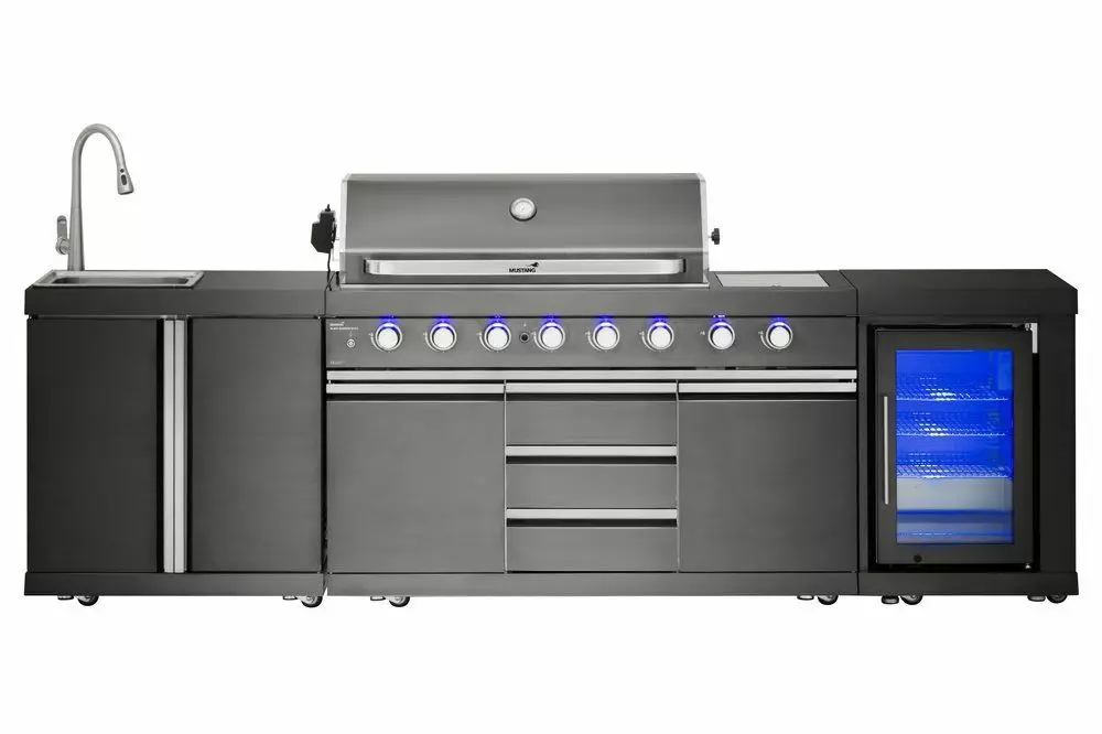 Näyttävä kaasugrilli kuudella polttimella, takapolttimella ja sivukeittimellä. Ulkokeittiöön kuuluu myös jääkaappi sekä vesiallas. Grillausala 96 x 46 cm. Rosteriputkipolttimet 6 kpl 3,5 kW, 1 sivupoltin 3,2 kW ja infrapuna takapoltin 3,5 kW varrasta varten. Kokonaisteho 27,7 kW. Piezo-sytytys sisäänrakennettu jokaiseen säätönuppiin, jotka valaistu. Lämmönjakopellit 6 kpl ruostumattomasta teräksestä. Materiaali kauttaaltaan 201 ruostumatonta terästä. Ruostumaton teräs on elektrolyysin avulla saatu mustan väriseksi. Tuplakansi lämpömittarilla, 2 kpl rosteri grillausritilöitä 30 x 45,5 cm sekä 1 kpl valurautaparila 35 x 45,5 cm. Lämmitysritilä ruostumatonta terästä 95,5 x 14 cm. Grillaustila valaistu. Suojapeite sekä grillivarras sisältyy tuotteeseen. 4 kaappia ja 3 vetolaatikkoa. 63 litranen jääkaappi lasiovella 220-240V 50Hz 80W IPX4 kompressori. Grillivarras toimii verkkovirralla. Vesihana ja -allas. 1/2" liitos vesiletkussa. 10 vuoden takuu. Tarkista takuuohjelma nettisivuilta.