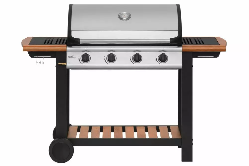 Näyttävä ja tukeva 4 valurautapolttimella varustettu kaasugrilli. Kokonaisteho 14,0 kW. Grillausala 77 x 41 cm, joka on jaettu mattaemaloidun grillausritilän 38 x 41 cm ja mattaemaloidun parilan 38 x 41 cm kesken. Lämmitysritilä kromatusta lankateräksestä 77 x 14 cm. Grillin näyttävät puuosat vastuullisesti kasvatettua puuta. Polttimien päällä aluminoidusta teräksestä valmistetut lämmönjakopellit 2 kpl. Piezo-sytytys sisäänrakennettu jokaiseen säätönuppiin. Grillin kansi ja ohjauspaneli 430 ruostumattomasta teräksestä. Grillin runko pulverimaalattua terästä. Tulilaatikon alla sinkitystä teräksestä valmistettu rasvapelti. Grillin siirtelyä helpottaa 2 isoa pyörää. Sopiva suojapeite 602301. Takuu 2 vuotta.