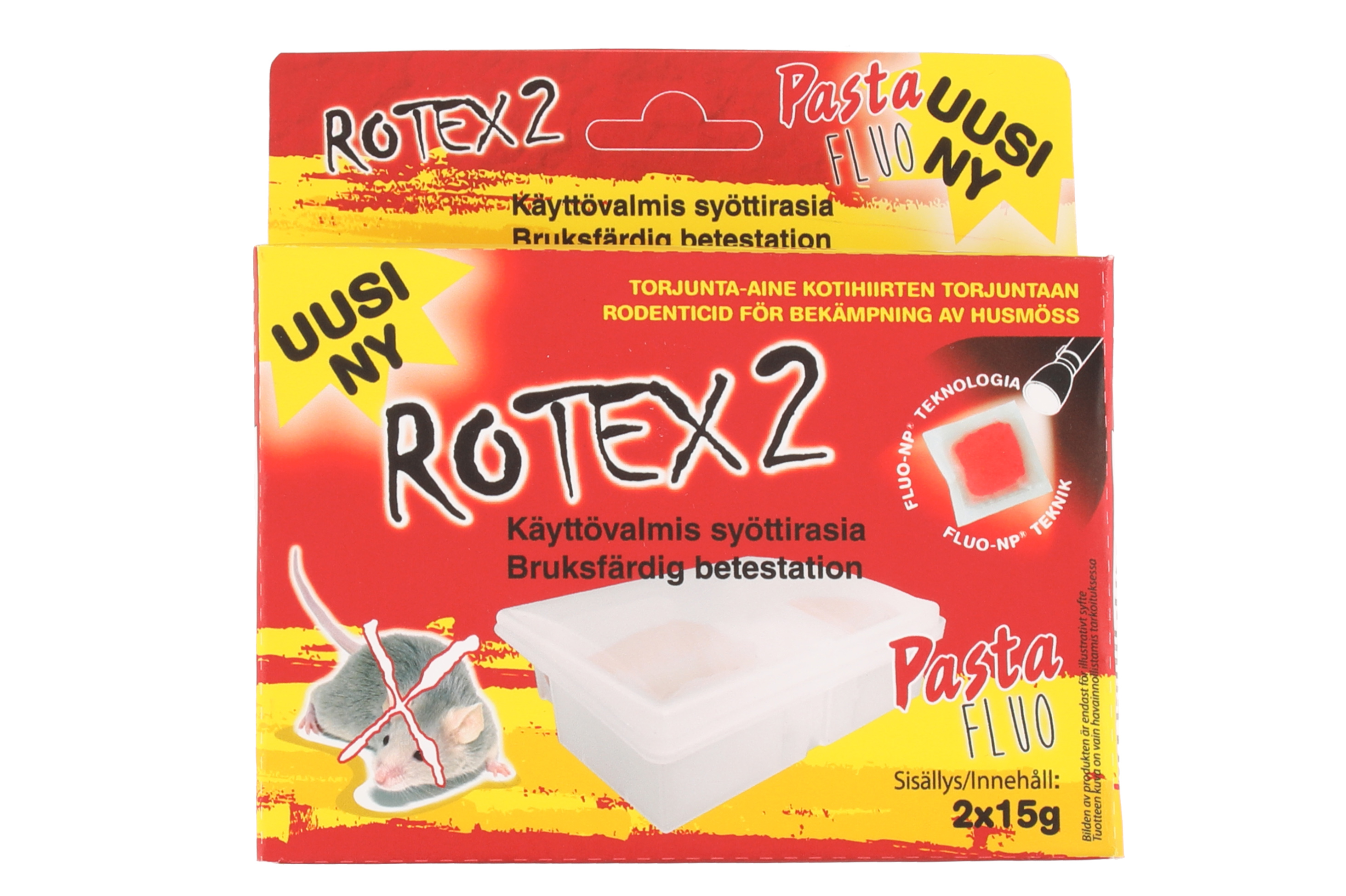 Torjunta-aine kotihiirten torjuntaan. Käyttövalmis syöttirasia, vain sisäkäyttöön. Fluo-NP® teknologia mahdollistaa jyrsijöiden toiminnan seuraamisen. Tehoaine brodifakumi. Maukas tahnasyötti.