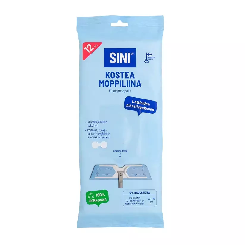 Hajusteeton liina on miellyttävä käsitellä. Käyttövalmiit kosteat moppiliinat ovat käteviä myös mökillä, asuntoautossa ja veneessä. Vahva materiaali kestää hankaamista ja sitoo lian tehokkaasti. Biohajoavan liinan voi hävittää biojätteen mukana. Käytä lattioille pikasiivoukseen SINI-monitoimimopissa pehmusteen kanssa. Kertakäyttömoppi sopii myös SINI-taittomoppiin pehmusteen kanssa.