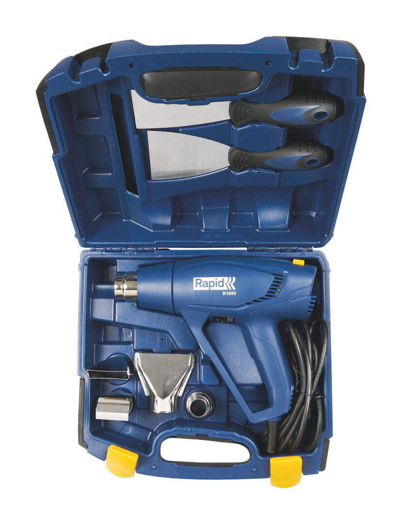 Kuumailmapuhallin R1800 kattavalla varustepaketilla kätevässä muovisalkussa. Tämä sarja sisältää puhaltimen lisäksi kaksi lastaa maalinpoistoon ja erilaisia suuttimia ilman ohjaamiseen käyttötarkoituksen mukaan.