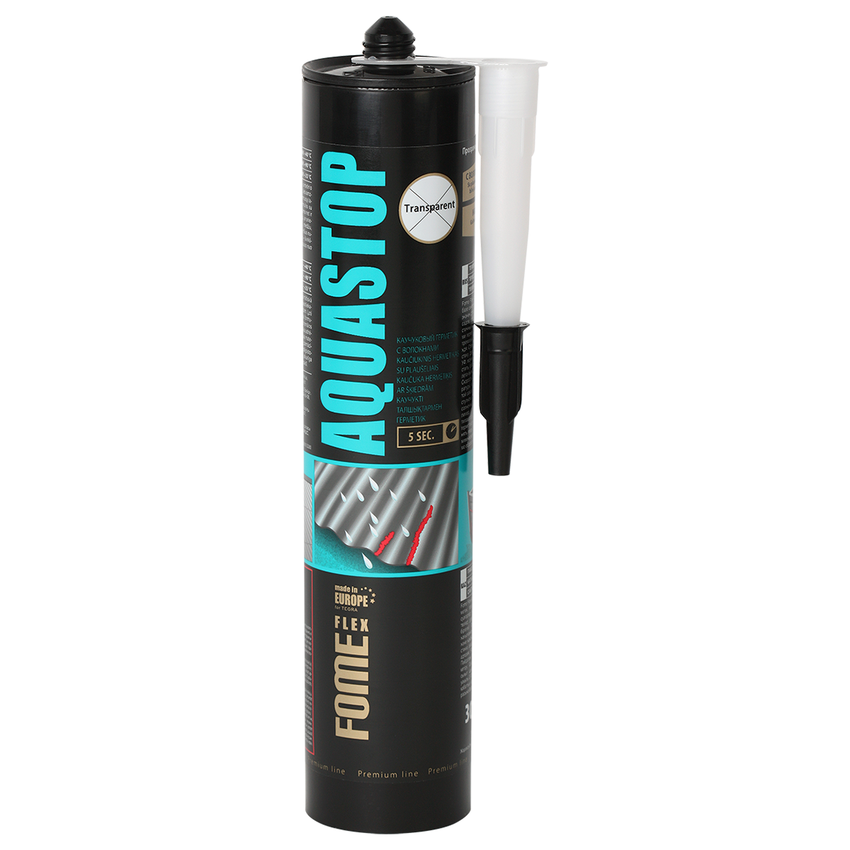 FOME FLEX SEALANT AQUASTOP – elastinen synteettinen kumi kuitupohjaisella rakennustiivisteellä, jota käytetään kattojen ja julkisivujen tiivistämiseen. Voidaan käyttää ullakkoikkunoiden laippojen, savupiippujen, kattojen tiivistämiseen ja korjaamiseen, kattokalvon ja kalvon liimaamiseen sekä kattojen ja vesikourujen vuotojen nopeaan korjaamiseen, myös sateessa. Tiivistää myös märät pinnat. Kestää UV-säteitä ja hometta. Tarttuu erinomaisesti moniin rakennusmateriaaleihin. Yhteensopiva bitumin ja