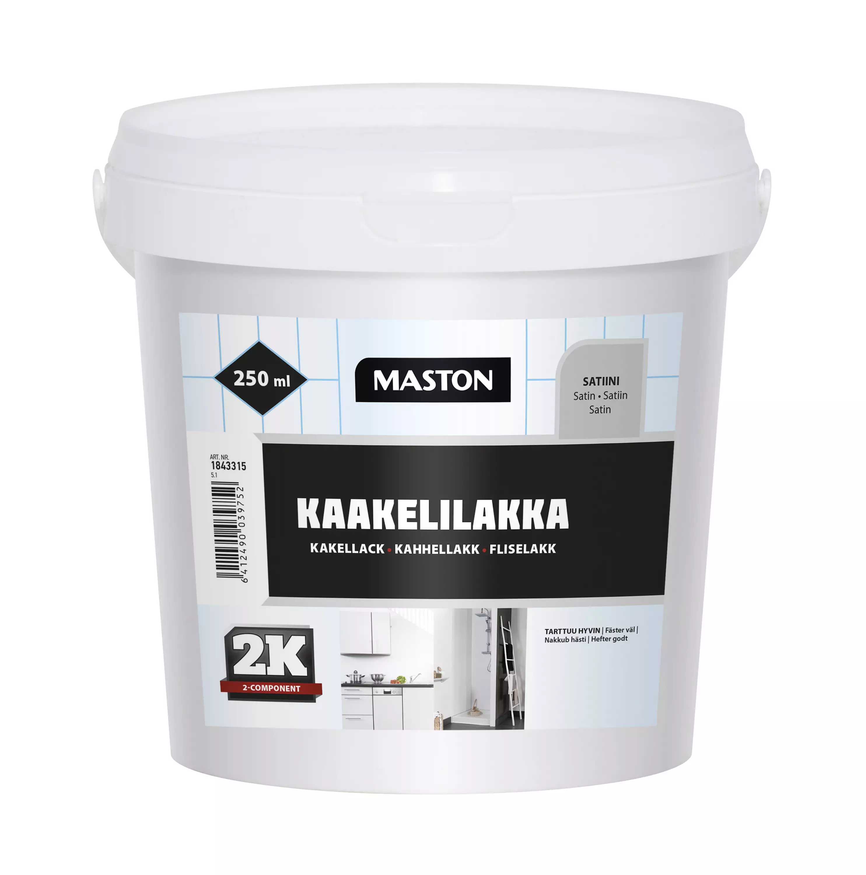Maston Kaakelimaali sisältää maalin ja kovetteen. Maston kaakelimaali on kaksikomponenttinen, vesiohenteinen epoksimaali, joka muodostaa lujan ja kestävän pinnan.
