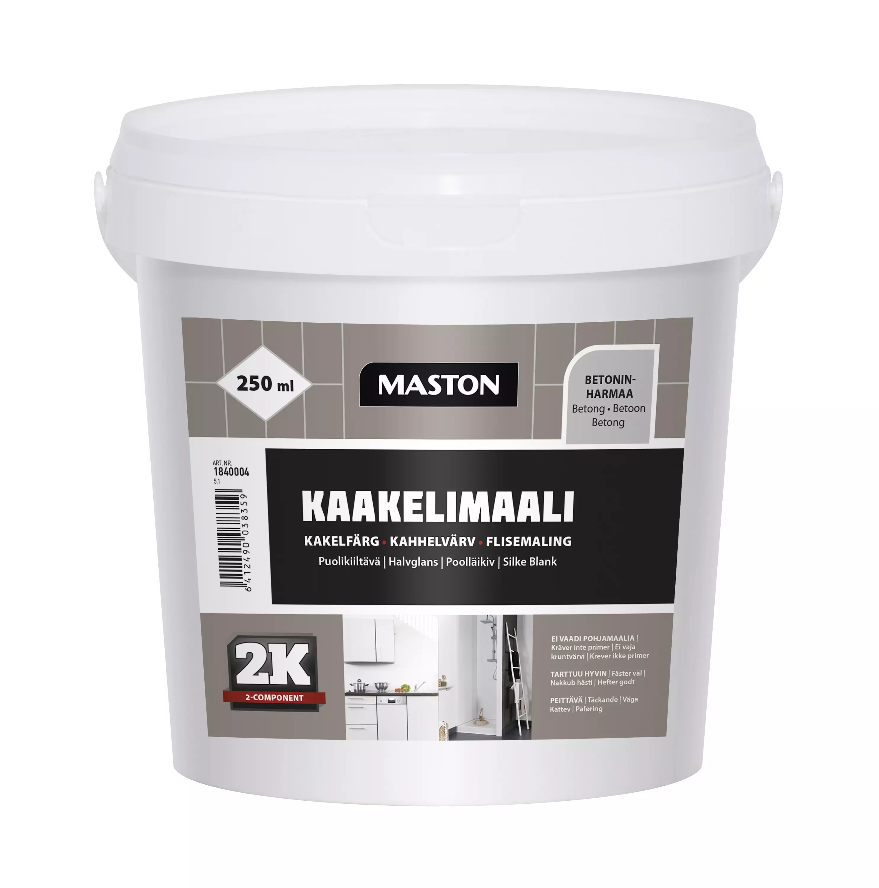 Maston Kaakelimaali sisältää maalin ja kovetteen. Maston kaakelimaali on kaksikomponenttinen, vesiohenteinen epoksimaali, joka muodostaa lujan ja kestävän pinnan.