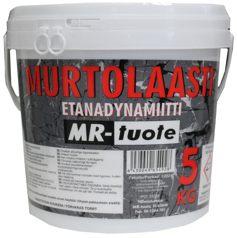 Murtolaasti / Etanadynamiitti 5 kg Soveltuu erinomaisesti: * Kallion louhintaan * Kivenjärkäleiden pilkkomiseen * Kallioleikkauksiin * Pihojen raivauksiin * Betoni- ja teräsbetonirakenteiden... Lue lisää