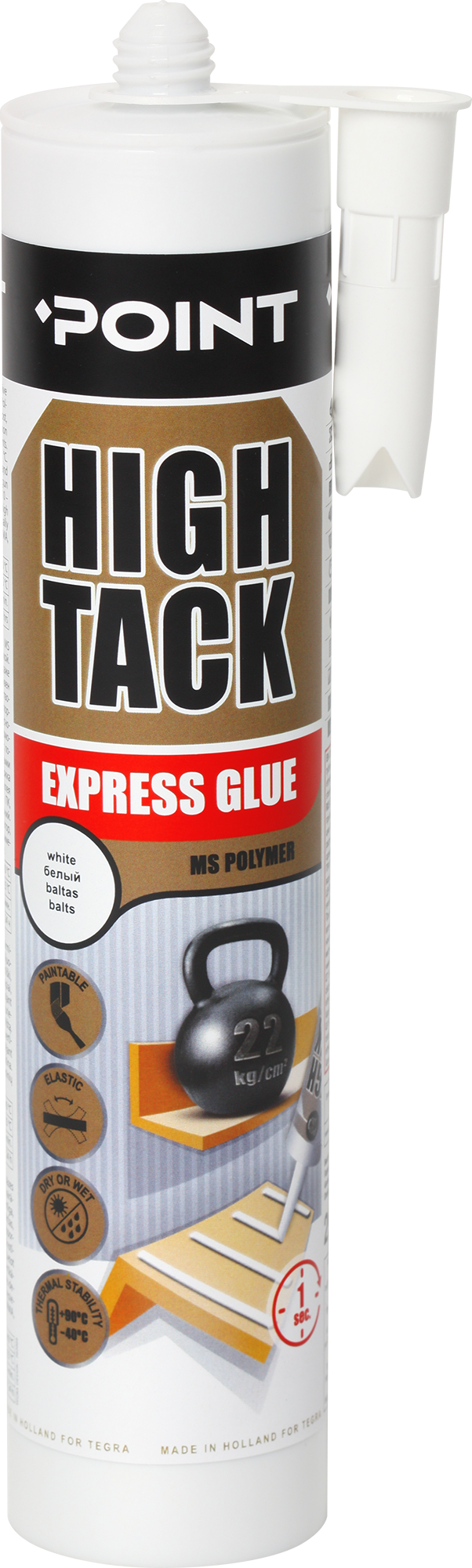POINT HighTack on hybriditeknologiaan perustuva MS-polymeeripohjainen rakennusliima, jolla on erittäin vahva alkutartunta. Soveltuu useimpien rakennusmateriaalien liimaamiseen jopa märille pinnoille. Muodostaa erittäin vahvan ja aina elastisen liitoksen. Tekee mahdolliseksi erittäin raskaiden rakennusosien kiinnittämisen ilman kannatusta tai tukea. Hajuton, ei aggressiivinen millekään materiaalille, soveltuu käytettäväksi sisä- ja ulkotiloissa,