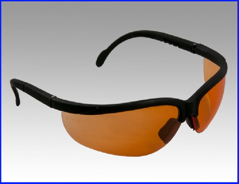 Laadukaat CE-hyväsytyt suojalasit oransseilla vääristämättömillä linssillä. Säädettävät sangat.