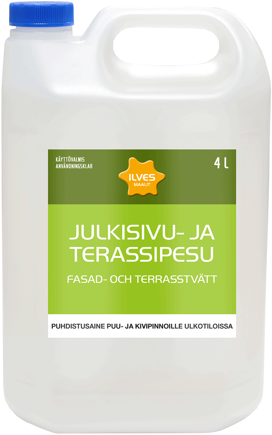 KÄYTTÖ: Suojaa lasi- ja alumiinipinnat. Vältä roiskeita vaatteisiin ja iholle. Suojaa myös puutarhakasvit. Testaa pesuaineen sopivuutta ensin pienelle alueelle. Levitä pesuaine ruiskulla, sumutepullolla tai harjalla. Anna vaikuttaa 5–10 minuuttia. Harjaa lika pois pehmeällä harjalla ja huuhtele huolellisesti. Ilves Julkisivu- ja terassipesu on käyttövalmis liuos vaativaan likaan. Tarvittaessa voit laimentaa sitä suhteessa 1 osa vettä ja 1 osa Ilves Julkisivu- ja terassipesua.