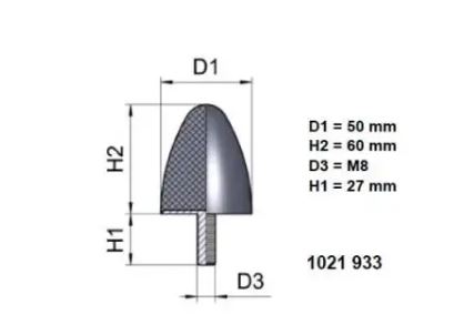 Kartiopuskin sinkityllä metalliosalla. Kartiomainen kumipuskin on valmistettu kumimateriaalista. Puskimet soveltuvat koneiden ja laitteistojen törmäysiskujen vaimentamiseen, liukuesteiksi sekä laitteistojen tassuiksi värinän ja äänen vaimennukseen.