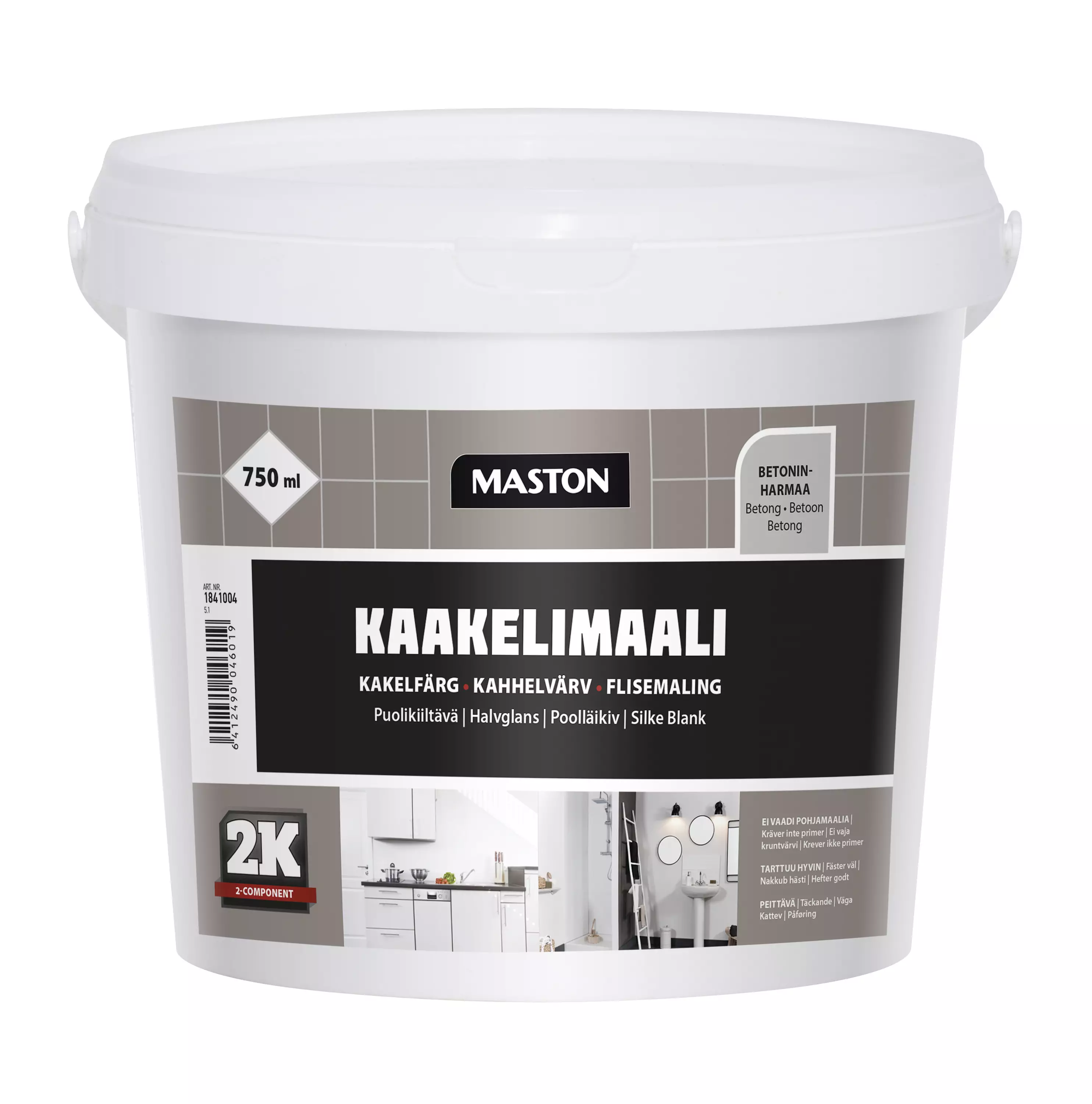 Maston Kaakelimaali sisältää maalin ja kovetteen. Maston kaakelimaali on kaksikomponenttinen, vesiohenteinen epoksimaali, joka muodostaa lujan ja kestävän pinnan.