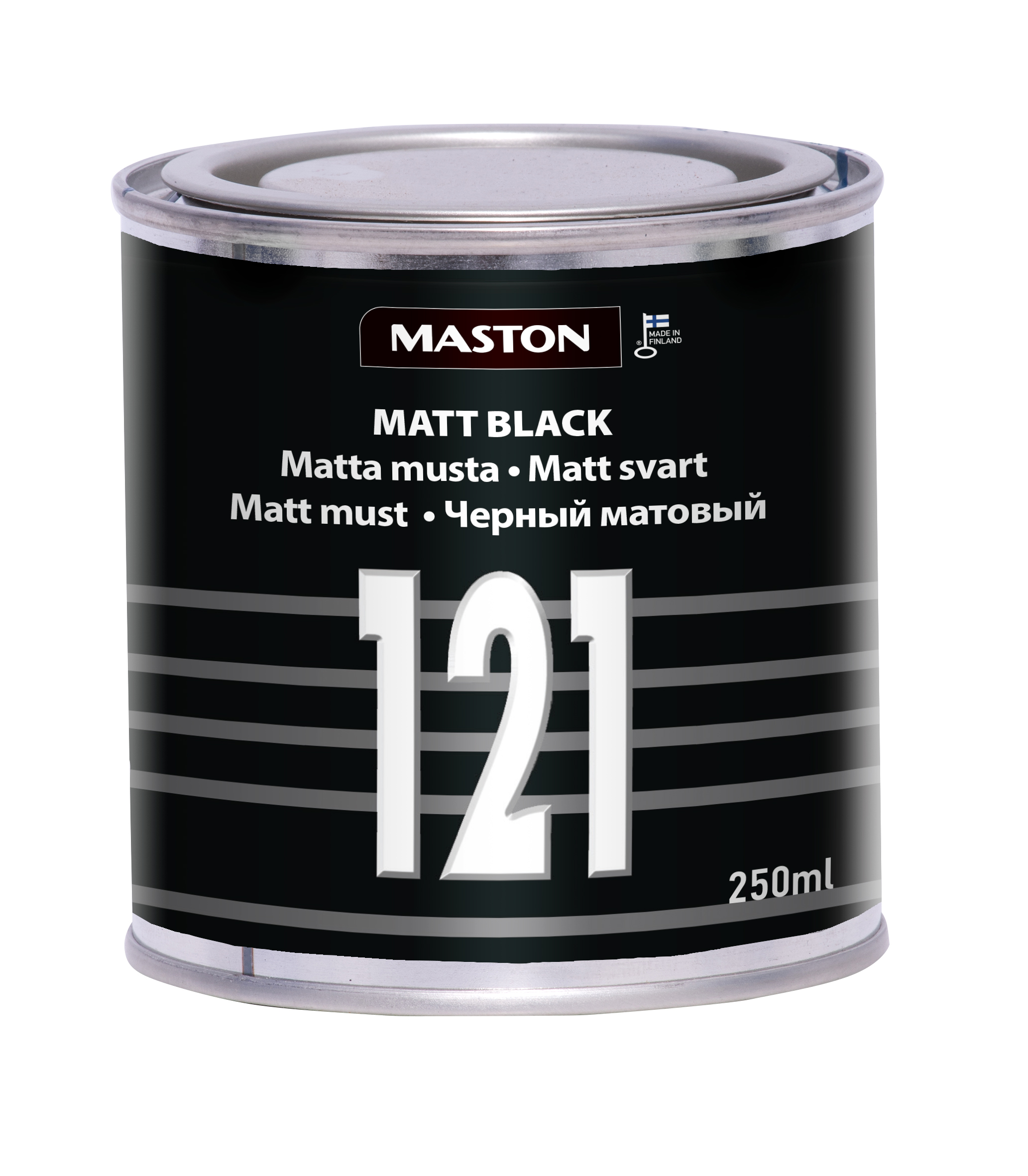 Maston Matta musta 121 on erittäin nopeasti ilmakuivuva alkydimaali sisä- ja ulkokäyttöön. Liuotinohenteinen alkydimaali