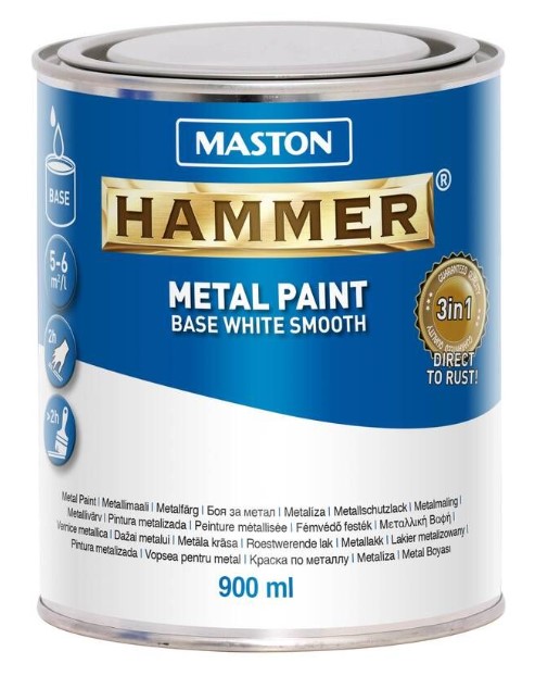 Hammer-tuote, joka pitää sävyttää. Sävytyksen jälkeen tuote on sama kuin tuttu Maston Hammer metallimaali, mutta omalla toivotulla värillä. Sävytys asiantuntevilla jälleenmyyjillä. Maston HAMMER SMOOTH (sileä) METALLIMAALI jossa ruosteenesto-, pohjamaali- ja pintamaali yhdessä muodostaa lujan, kiiltävän pinnan kaikille metallipinnoille. Soveltuu sisä- ja ulkokäyttöön. Voidaan levittää suoraan käsiteltäville pinnoille, myös ruosteisille pinnoille. Ilmaa ja kosteutta läpäisemätön maalikerros pysäyttää korroosion ja suojaa metallipintaa tehokkaasti. Soveltuu myös puupintojen käsittelyyn.