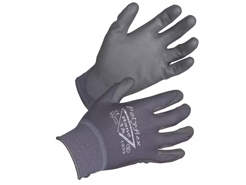 Polyesteri & nylon sormikas. Polyuretaani pinnoite. Hengittävä selkämys. Neuletiheys: 13 g Koot: 7/S - 11/XXL Pakkaus: 12pr/nippu, 240pr/laatikko