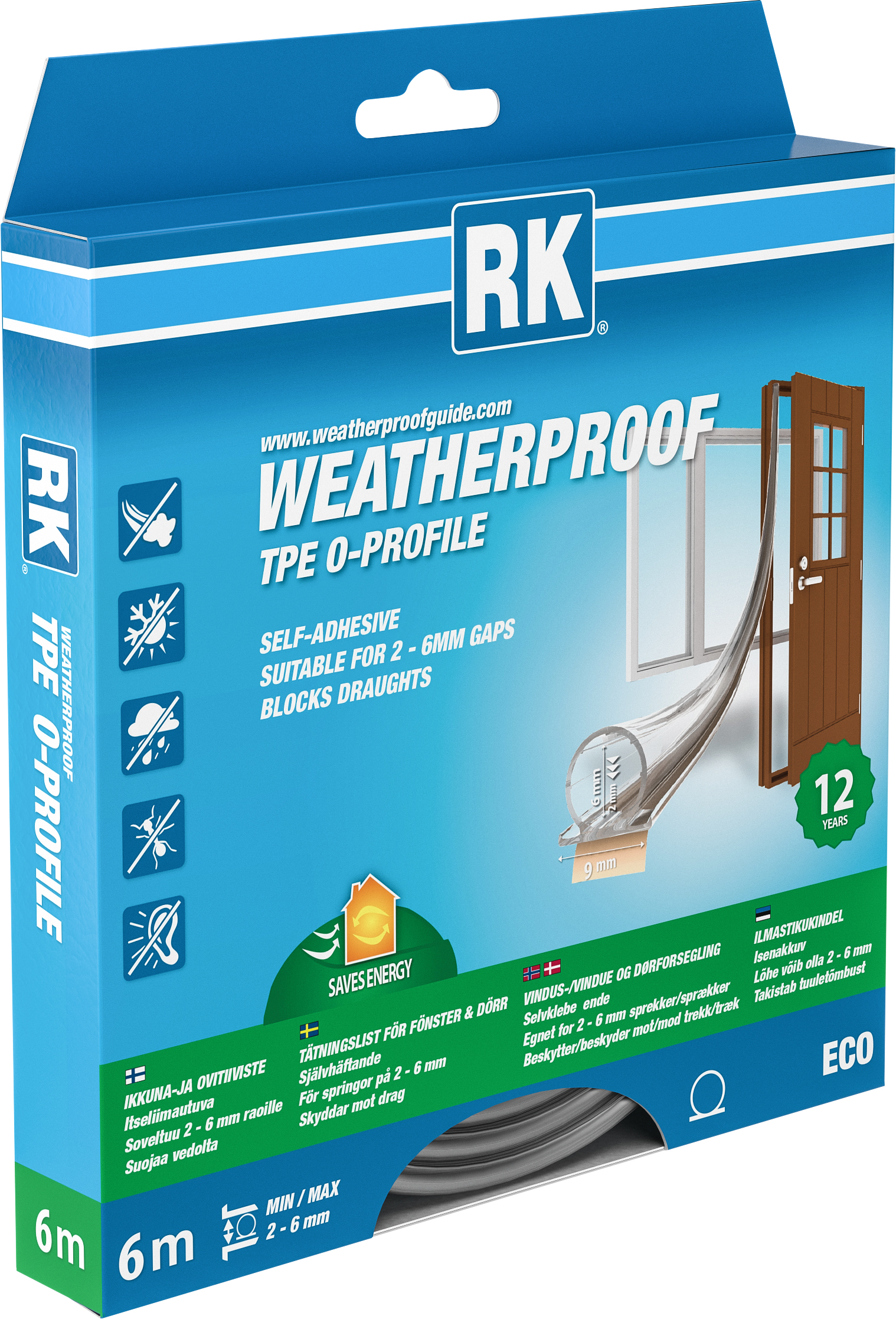 RK Ikkuna- ja Ovitiiviste TPE on itseliimautuva väritön termoplastinen elastomeeritiiviste (TPE) oviin ja ikkunoihin. TPE on uutta, nykyaikaista, korkealaatuista, täysin kierrätettävää materiaalia ja se on helppo asentaa. Ovien ja ikkunoiden tiivistämiseen. Suojaa vedolta, pölyltä, kylmyydeltä/kuumuudelta, sateelta, kosteudelta, hyönteisiltä, melulta ja auttaa säästämään energiaa. Joustava, veden- ja pesunkestävä.