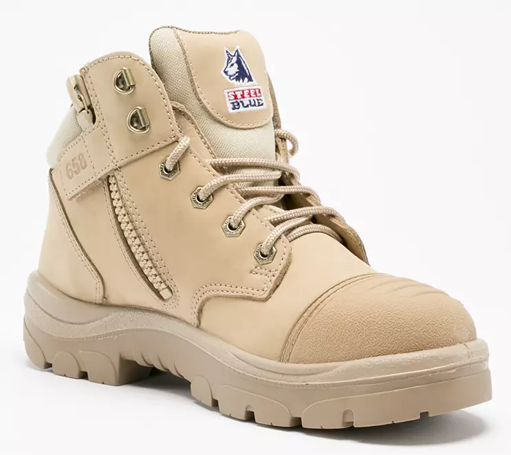 Parkes Zip Sand S3 On 9,5cm vaelluskenkätyylinen nauhallinen ja keskipituinen kenkä, jossa pehmustetut varren kaulus ja läppä. Valmistettu laadukkaasta, hengittävästä sekä vettähylkivästä naudan nupukkinahasta. Tässä turvakenkässä on 200J:n iskua kestävä teräskärki, sekä teräksinen naulaanastumissuoja. Käyttömukavuutta ja nopeutta turvakengälle lisää kestävä teollisuusluokan sivuvetoketju.