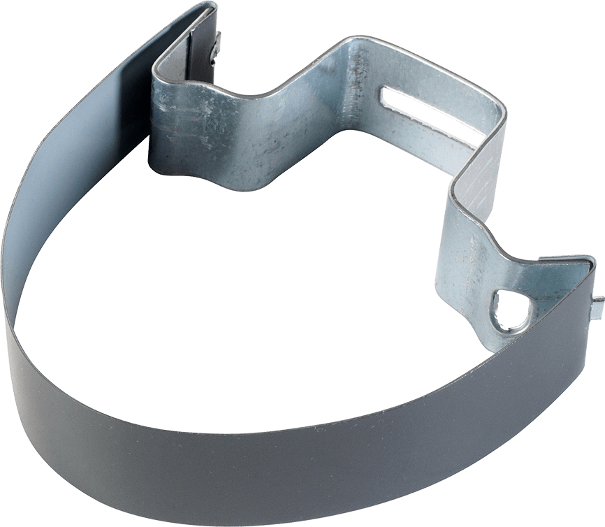 Syöksytorven kiinnityspannan pohjaosa sinkittyä terästä ja syöksytorven kiinnityspanta pinnoitettua terästä. (sadevesijärjestelmän osa, seinäkiinnike). Vakiona 100 mm putkeen sopiva.