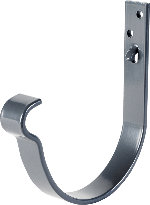 Puolipyöreän vesikourun koukku (sadevesijärjestelmän osa). Asennustiheys n. 900 mm. Lisäksi saatetaan tarvita kourun kiilapala. Vakiona 125 mm kouruun sopiva. Pinnoitettua terästä.