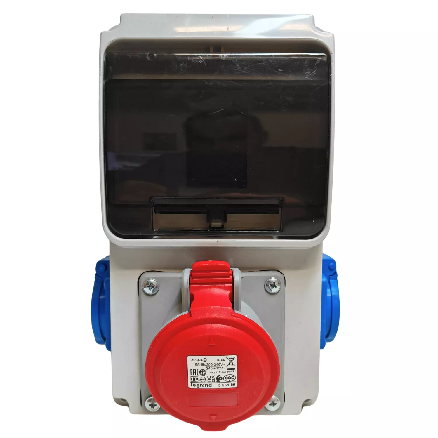 Pistorasiakotelo, jossa mukana 1kpl 5P 16A voimapistorasia ja 2kpl 2P schuko. Kotelointiluokka IP65. 6 moduulia tyhjää tilaa.