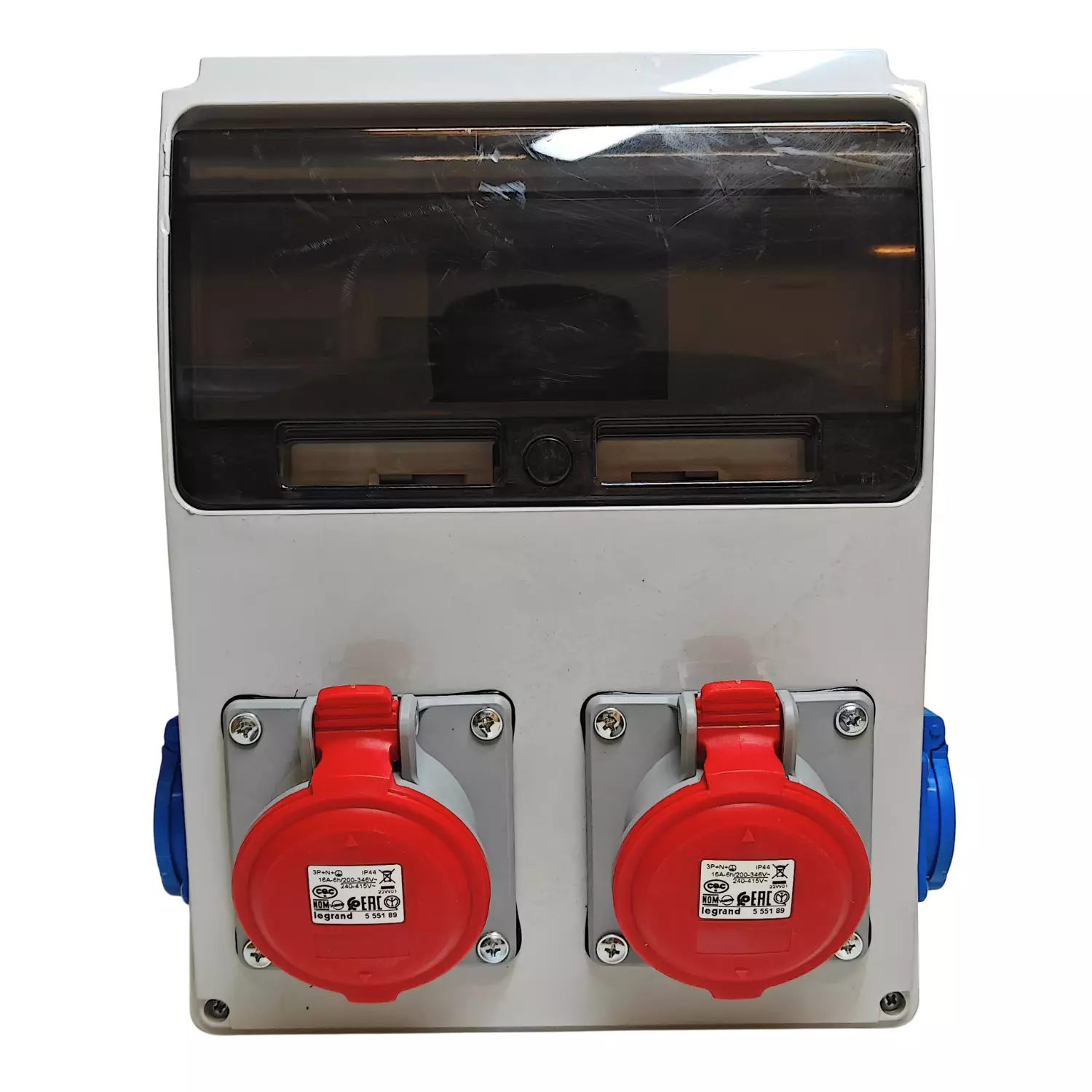 Pistorasiakotelo, jossa mukana 2kpl 5P 16A voimapistorasia ja 2kpl 2P schuko. Kotelointiluokka IP65. 11 moduulia tyhjää tilaa.