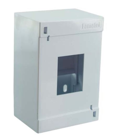 Pinta-asennettava Famatel-moduulikotelo. Soveltuu kuiviin tiloihin. Famatel 4 moduulia