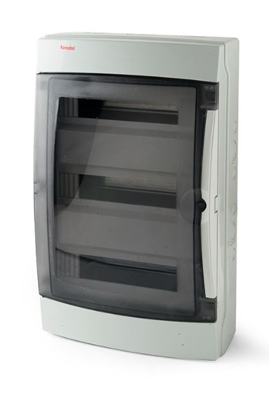 Pinta-asennettava Famatel-moduulikotelo. Soveltuu kosteisiin tiloihin. Famatel 42 moduulia sähkökaappi, sähkötaulu, sulaketaulu, sulakekaappi, sähkökeskus