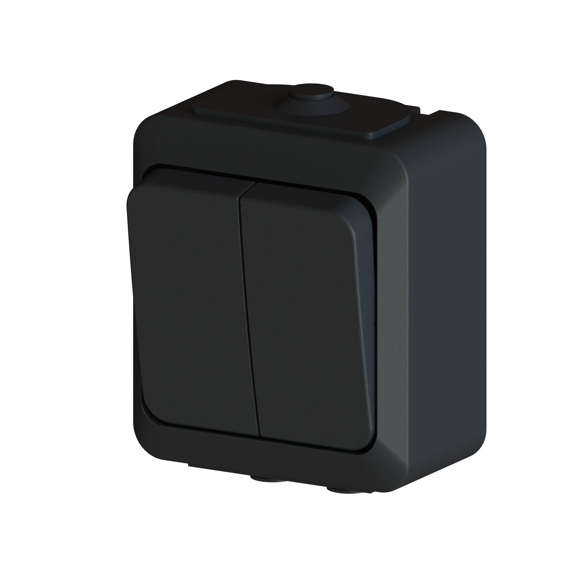 Harju HIILI-sarjan mattamusta pinta-asennettava roiskevesitiivis kruunukytkin, joka soveltuu myös kosteisiin tiloihin ja ulkokäyttöön. Kytkentä ruuviliittimin. Kotelointiluokka IP44.