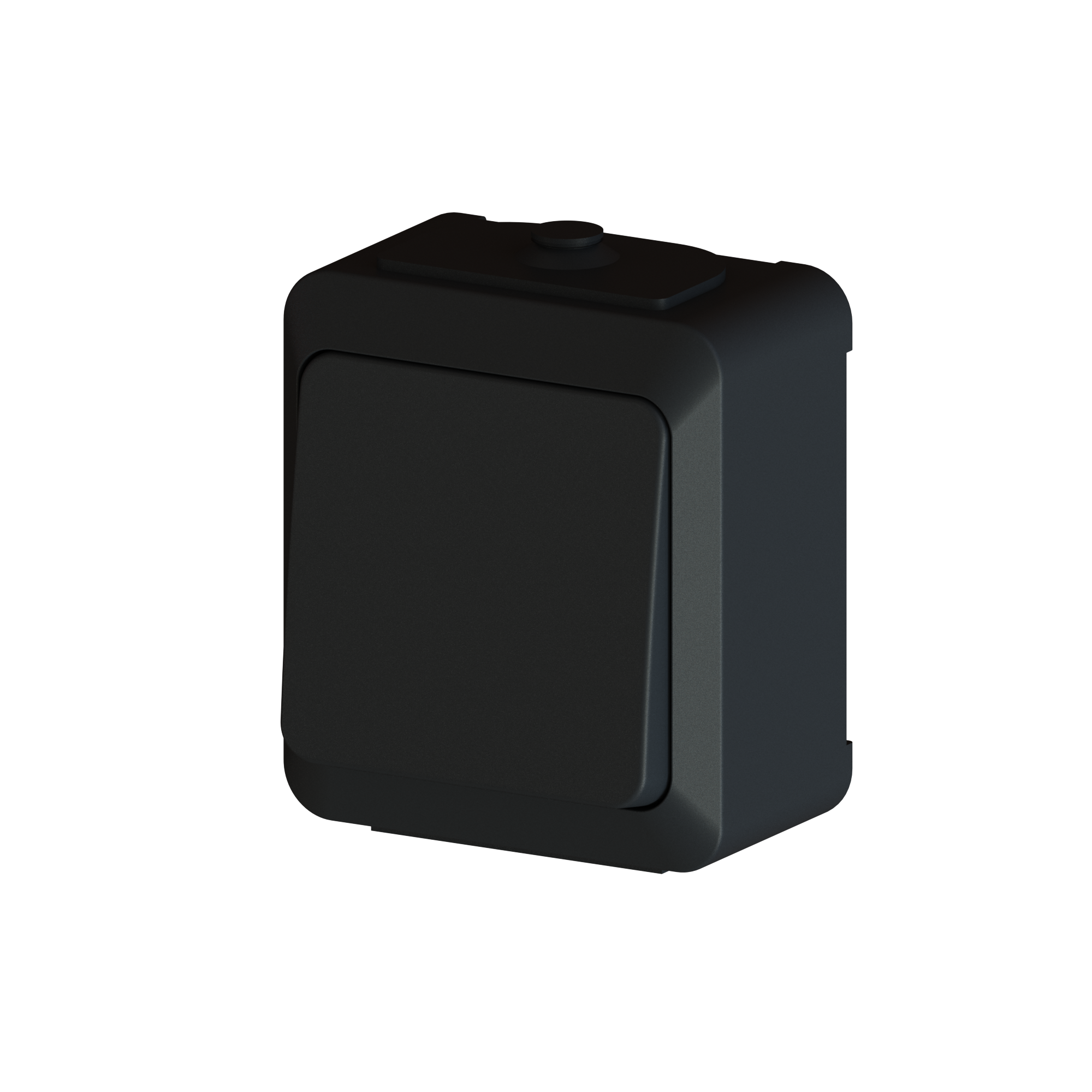 Harju HIILI-sarjan mattamusta pinta-asennettava roiskevesitiivis 1/6 kytkin, joka sopii kosteisiin tiloihin ja ulkokäyttöön. Kytkentä ruuviliittimin. Kotelointiluokka IP44.