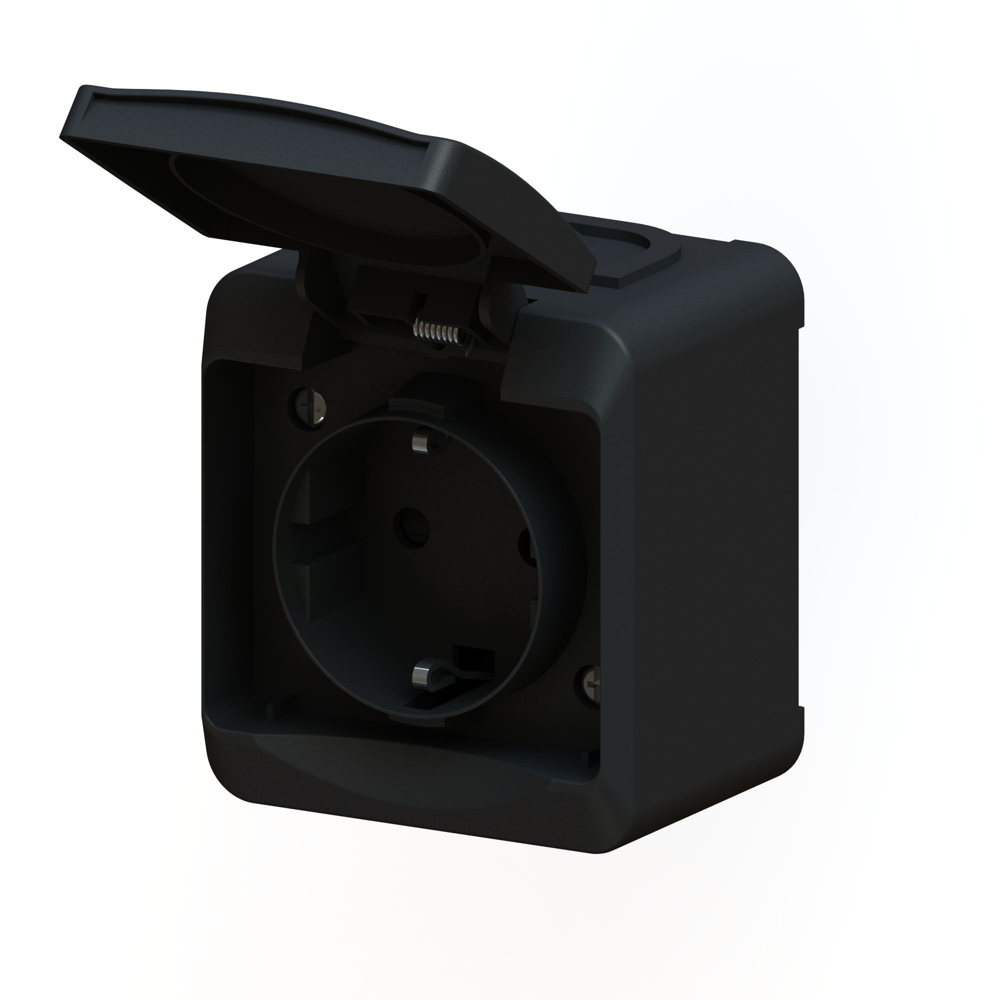 Harju HIILI-sarjan pinta-asennettava 1-osainen musta maadoitettu pistorasia. Roiskevesitiivis pistorasia soveltuu kosteisiin tiloihin ja ulkokäyttöön. Kytkentä ruuviliittimin. Kotelointiluokka IP44.