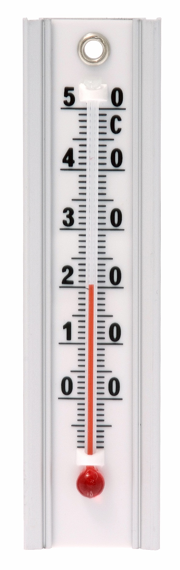 Huonelämpömittari hopeanvärisellä alumiiniprofiililla. Mittarissa on reikä ripustusta varten. Mitat 12 x 3 cm, mittausalue -10..+50°C.