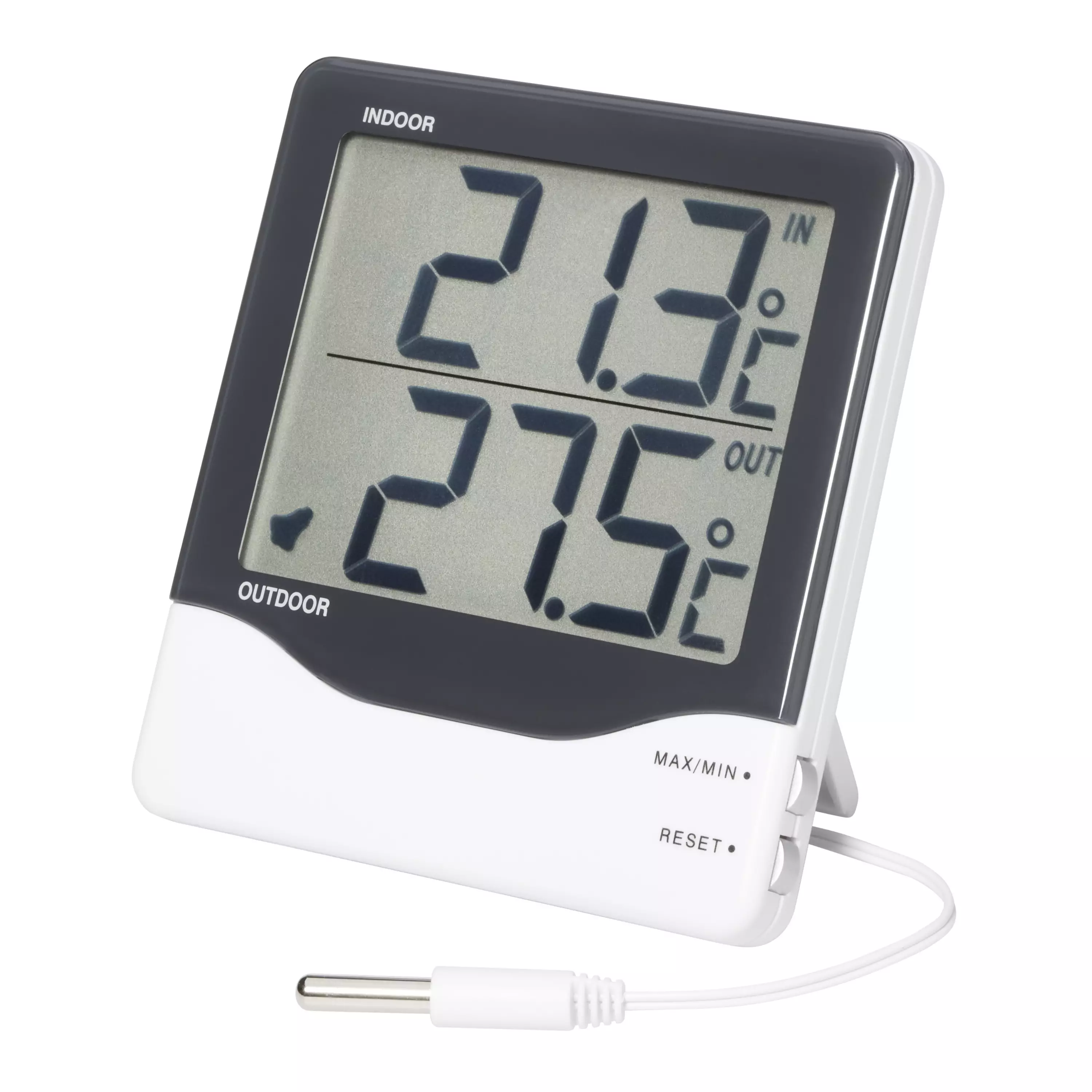 Lämpömittari ulko- ja sisälämpötilan mittaamiseen. Mittarissa on isot selkeät numerot joiden korkeus on 28 mm. Ulkolämpötilalle voi asettaa ylä- ja alarajahälytyksen. Lämpötilan maksimi- ja minimiarvot jäävät muistiin, joka nollataan manuaalisesti. Anturijohdon pituus on kolme metriä. Lämpömittarin voi asettaa pöydälle seisomaan tai sen voi ripustaa roikkumaan seinälle. Paristo (1 kpl AAA 1.5V) ei sisälly pakkaukseen. Mittausalue: sisälämpötila -10..+60°C, ulkolämpötila -50..+70°C Tarkkuus: ±1°C Mitat: 112 x 102x 22 mm.