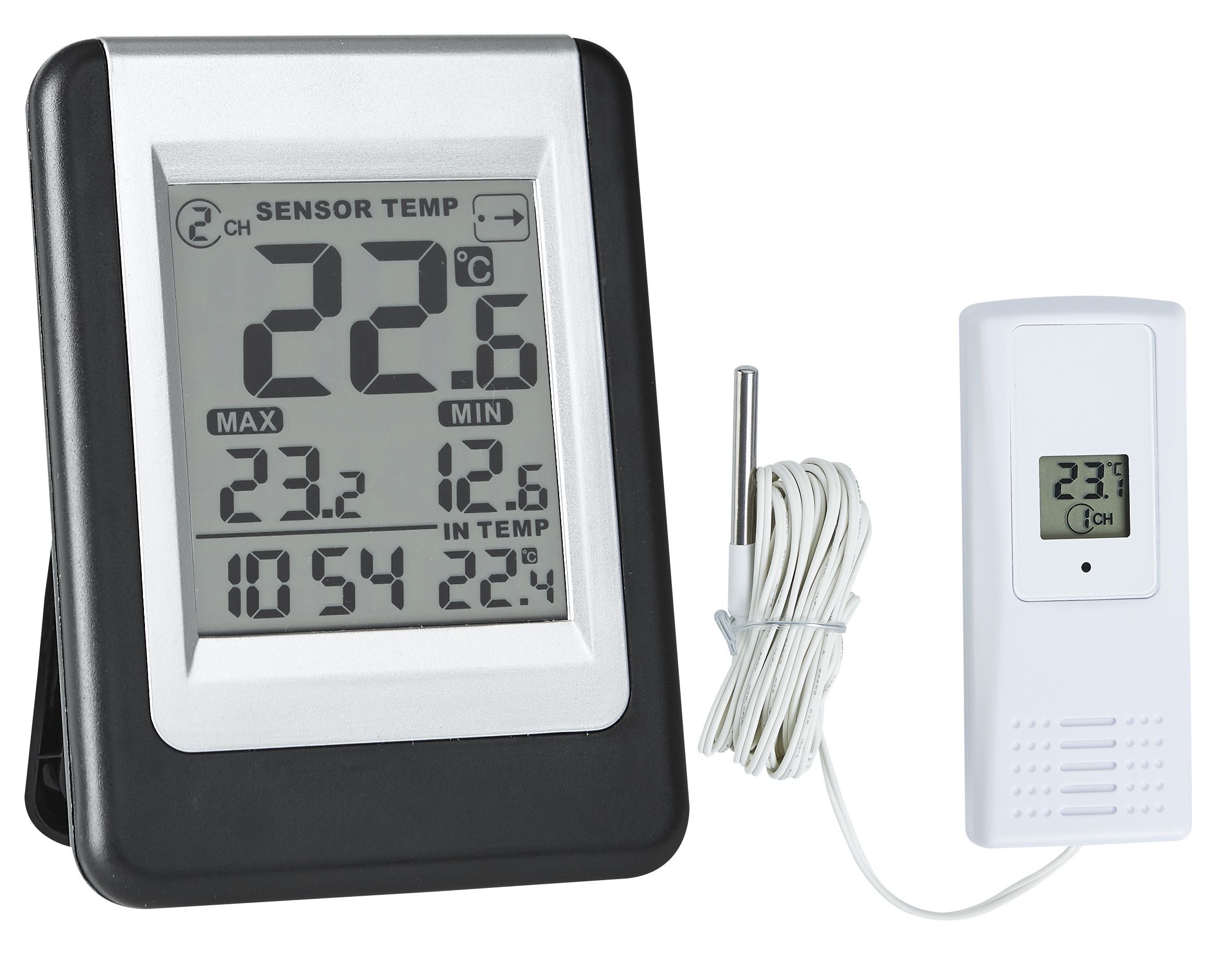 Mittaa ulkoilman, saunan tai veden lämpötilaa! Lähettimessä on erittäin laaja mittausalue +150°C asti, joka mahdollistaa sen käytön esimerkiksi saunan lämpötilan mittaamisessa. Lähettimessä on kolme metriä pitkä lanka-anturi. Voit myös asettaa hälytyksen, jolloin mittari antaa äänimerkin, kun asetettu raja ylittyy tai alittuu. Tieto lähetetään langattomasti lähettimestä näyttöyksikköön taajuudella 433 MHz. Kantama on max. 80 metriä vapaassa tilassa. Mittarissa on kello ja maksimi/minimi-muisti. Mittausalue: sisälämpötila 0..+60°C, ulkolämpötila -40..+150°C. Seinä- tai pöytäasennus. Paristot 5 kpl AAA 1.5 eivät sisälly pakkaukseen. Näyttö 102 x 75 x 20 mm, lähetin 110 x 45 x 21 mm.
