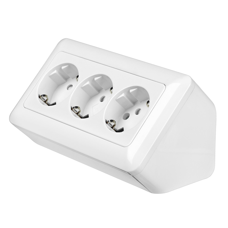 3-osainen maadoitettu ja pinta-asenteinen kulmapistorasia. Kotelointiluokka IP20, 16A / 250V.