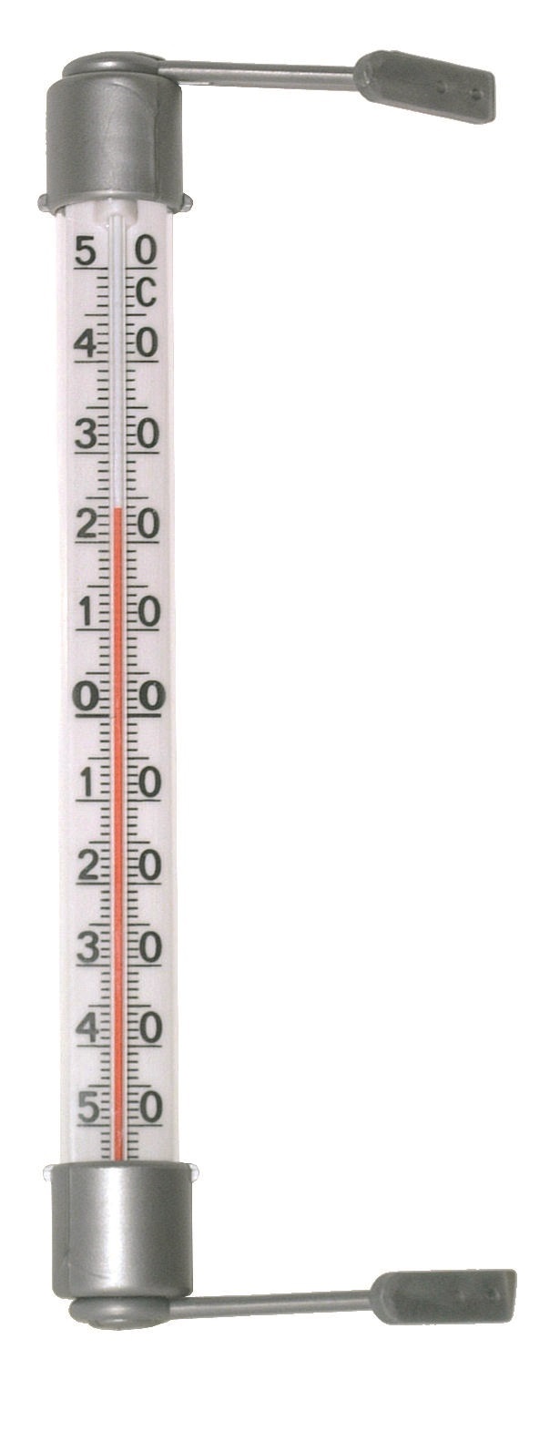 Ikkunanpuitteeseen kiinnitettävä ulkolämpömittari. Mittarissa on harmaat päät ja lasiputki. Lasiputkea voi kääntää sopivan katselukulman löytämiseksi. Korkeus 20 cm, mittausalue -50..+50°C.